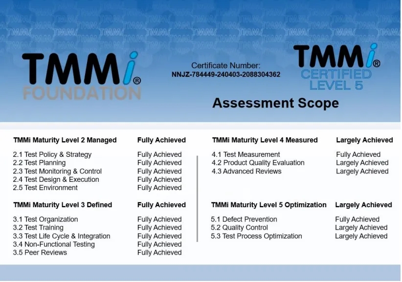 在本次TMMi5级认证过程中,神州信息咨询认证团队依据TMMi基金会推荐使用的IDEAL模型,进行了差距分析、体系优化建模、项目试点、预评估与正式评估等一系列改进和认证评估工作。TMMi咨询评估团队经过客观、认真细致而全面的评估,一致确认融信在TMMi高成熟度方面表现出业界专业水平,完全符合TMMi5级的16个过程域标准。